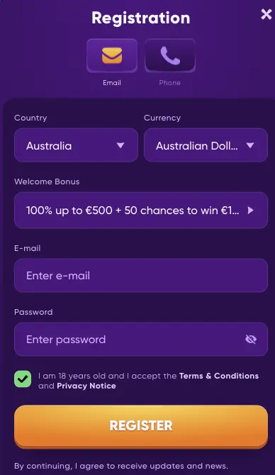 - On the casino’s home page, click on the orange “Register” button. You will find it in the upper right corner of your screen.