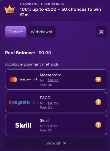 Players from Greece can use a wide range of payment methods for their transactions. It is up to each player to choose the method that suits them best and with which they are most familiar. Overall, electronic wallets, cryptocurrencies, bank cards, and prepaid cards are offered, as well as the option of bank transfers.