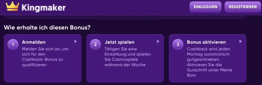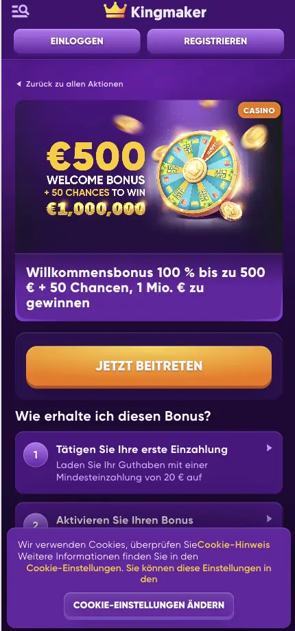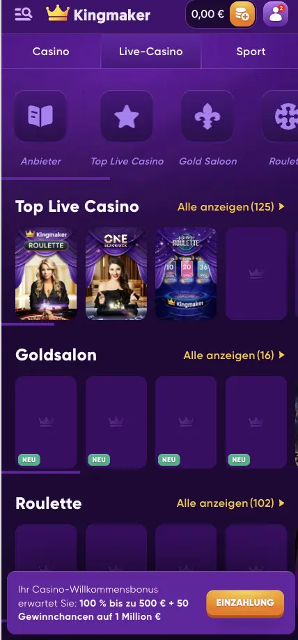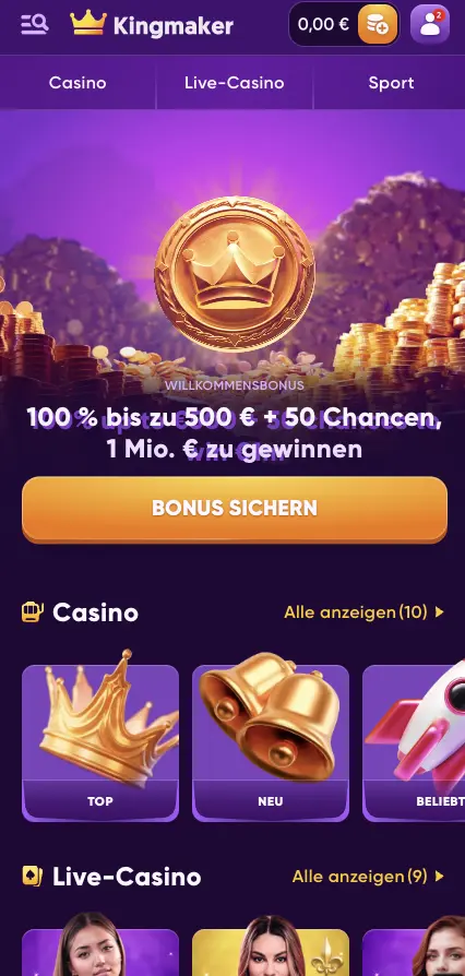 Kingmaker wurde im Jahr 2023 gegründet und hat sehr bald die Vorlieben vieler Online-Casino-Fans gewonnen. Es ist eine sehr reichhaltige und benutzerfreundliche Plattform, die eine Reihe von hochwertigen Dienstleistungen bietet. Alles in allem kann es Ihnen ein besonders positives Wett-Erlebnis bieten, mit Tausenden von Spielen, sehr reichhaltigen Promotionen und vielem mehr.