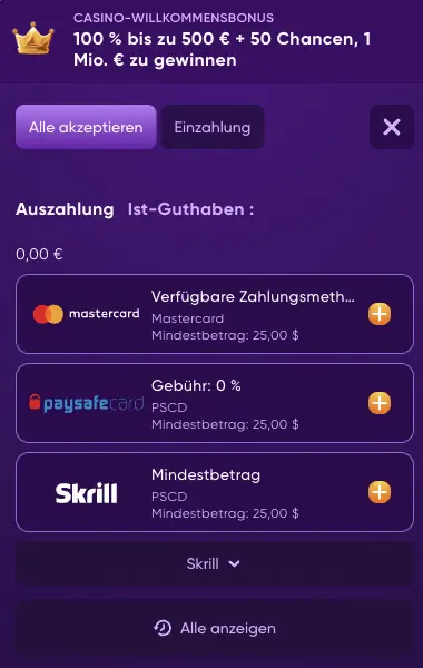 | Willkommensbonus | 100% Ersteinzahlungsbonus bis zu 500 € und 25 Freispiele. |